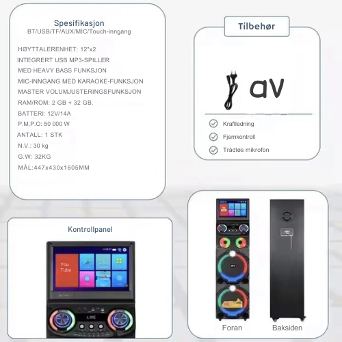 - Tilkobling: Bluetooth 5.0, Wi-Fi, USB, TF, AUX-IN, MIC-IN